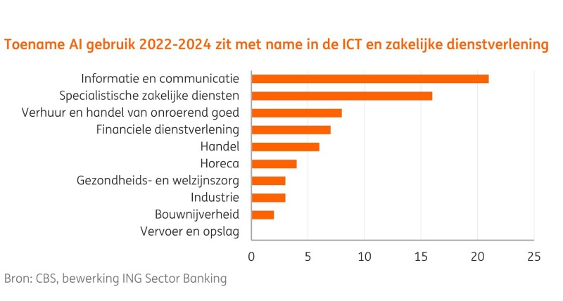 In 2024 maakte bijna 23% van alle bedrijven met meer dan 10 werknemers gebruik van één of meer AI-technologieën. Dat is een flinke stap vooruit ten opzichte van 2023. Toen bleef dat percentage steken bij 13,8%. De stappen voorwaarts zijn te danken aan het beschikbaar komen van standaard software. Het is niet helemaal verrassend dat de grote bedrijven vooroplopen in acceptatie van AI. Bijna 60% van alle grote bedrijven maakt gebruik van AI. De populairste technologieën zijn vooralsnog tekst mining en natural language.
