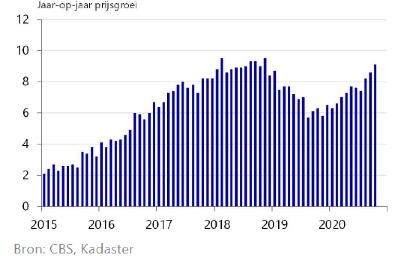 Verwachtingen voor 2021Je hoeft geen profeet te zijn om te voorzien dat in 2021 het verschil tussen vraag en aanbod alleen maar verder zal oplopen. Op de markt overheerst immers nog steeds het adagium eerst kopen dan pas verkopen. Die attitude is niet ze vreemd, omdat in Nederland de nieuwbouw stokt als gevolg van de stikstofcrisis.Het gevolg van deze trend is, dat in het lopende jaar, maar ook volgend jaar het aantal transacties gaat afnemen. Er zijn simpelweg te weinig huizen. Dat laatste feit zorgt ervoor dat de prijzen omhoog blijven gaan. De schaarste wordt immers steeds groter.Het goedbedoelde beleid van de Nederlandse overheid zorgt nog eens voor extra druk op de prijzen. Huizenkopers jonger dan 35 jaar hoeven in 2021 geen overdrachtsbelasting meer te betalen. Zodoende stijgt de koopkracht van deze groep. Bovendien heeft het kabinet de hypotheeknormen voor tweeverdieners verruimd, evenals voor Nederlanders met een studieschuld.. Het is tenslotte niet ondenkbaar dat ook in 2021 de hypotheekrente licht blijft dalen. Kortom, de aspirant koper heeft meer biedingskracht op een markt waar tekorten domineren. Dat moet prijzen wel omhoog jagen.Alleen een omslag in de economie kan voor een tempering van de stijging zorgen. Als de economie stagneert, dan zal de werkloosheid gaan oplopen. Dat zal in eerste instantie de jongeren in de flexibele schil treffen. Voor deze groep zal een eigen woning dan nog onbereikbaarder worden dan nu al het geval is. Huurprijzen zijn al hoog en hebben de neiging verder te stijgen. Op de markt voor koopwoningen heerst meer en meer een biedingenstrijd en daarmee heerst het recht van de sterkste. Zodoende kunnen sociale spanningen en tegenstellingen in Nederland in 2021 en verder verscherpen. Daar zit niemand op te wachten.