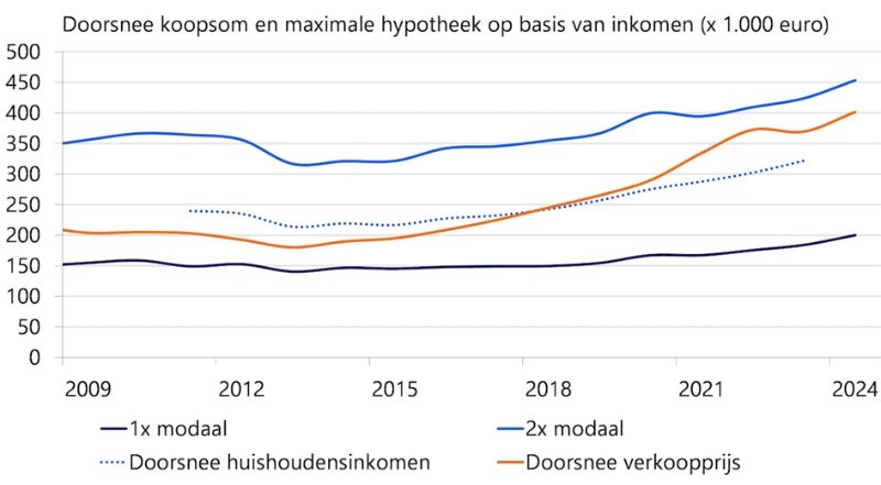 Die mooie ontwikkeling van het mediane huishoudensinkomen is meer en meer een schrale troost. In 2024 konden potentiele koopstarters op basis van dit inkomen Euro 331.000 lenen. Bij een gemiddelde koopprijs van pakweg Euro 400.000 kom je echter tekort. Zoals al eerder geconstateerd, twee op de drie koopwoningen zijn in de praktijk te duur.