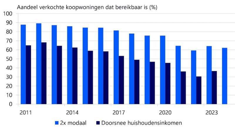 In 2023 kon een potentiële koper met twee modale inkomens ongeveer 64% van alle verkochte koopwoningen financieren. Voor doorsnee huishoudens met een doorsnee inkomen waren de mogelijkheden beduidend minder. Nog slechts 37% van de verkochte woningen was financieel binnen handbereik. Ongeveer 2 op de 3 woningen waren dus financieel onhaalbaar.