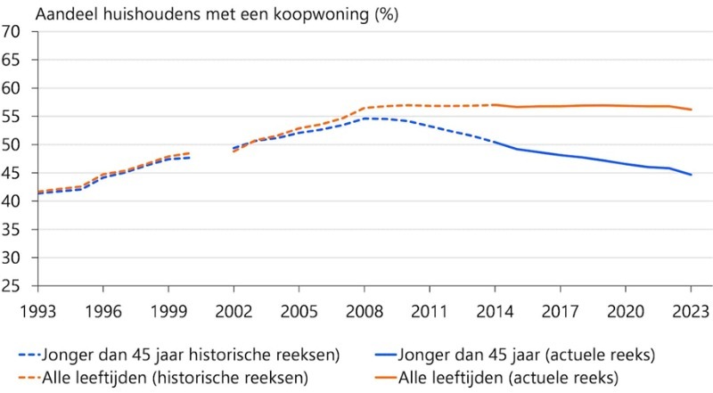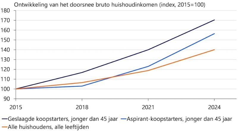 In 2024 hadden 45-minners die het lukte om een eerste huis te kopen een huishoudensinkomen van bijna Euro 88.000. Dat inkomen ligt hoger dan van ruim 64% van alle zelfstandige huishoudens in dit land.