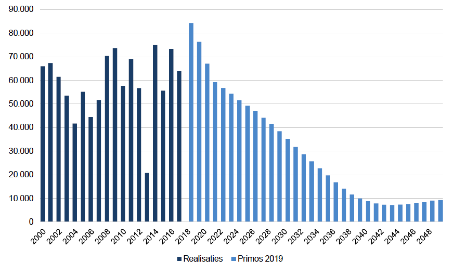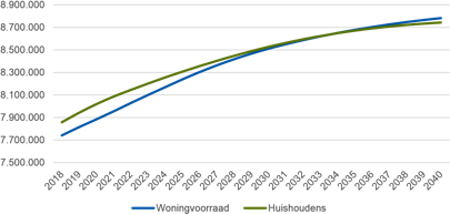 Belangrijk voor de woningmark van morgen is ook hoe de woonvoorkeuren zich ontwikkelen. Er is een groot verschil tussen starters en huurders enerzijds en eigenaars/doorstromers anderzijds. Van de laatste groep wil 89 % opnieuw kopen en slechts 11 % huren. Bij starters en huurders liggen de verhoudingen heel anders. Daar wil ongeveer 40 % kopen en maar liefst 60 % huren. Sinds 2015 is er een verschuiving merkbaar bij starters van huren naar kopen.Voor al die potentiële kopers en huurders is het wel prettig om te weten hoeveel er de komende jaren bijgebouwd gaat worden. Aan één ding twijfelt niemand. Anno 2019 zijn er veel meer gegadigden voor woningen dan dat er aangeboden worden. Prijzen blijven daarom stijgen en het ene record na het andere sneuvelt. Woningzoekenden hoeven zich voorlopig weinig illusies te maken. Tot 2030 komen er jaarlijks ongeveer 64.000 woningen bij. Dat klinkt mooi, maar het betekent wel dat pas over pakweg 10 jaar er een redelijk evenwicht zal zijn tussen vraag en aanbod.Figuur 3 Ontwikkeling woningvoorraad en aantal huishoudens