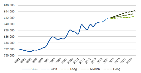 In de komende edities van deze Nieuwsbrief nemen we in eerste instantie de verschillende scenario’s onder de loep. In tweede instantie gaan we kijken naar de effecten van de verschillende scenario’s voor de inrichting van de woningmarkt van morgen. Voorspellen is moeilijk, juist omdat het de toekomst betreft. Daarom moet een overheid, die iets zinnigs op papier wil zetten, wel werken met scenario’s. Daarin komen een reeks van variabelen aan bod die medebepalend zijn voor de ontwikkelingen op de woningmarkt.Een eerste variabele is uiteraard de demografie. Hoe ontwikkelt de bevolking zich in dit land. De meest onzekere factor daarbij is de instroom van migranten. Die laat zich maar moeilijk voorspellen. Een centrale rol spelen – bij het becijferen van de demografische ontwikkeling –de kernprognoses 1918 – 2060 van het Centraal Bureau van de Statistiek. Volgens de meest recente prognose zal de Nederlandse bevolking sneller toenemen dan verwacht, omdat er meer migranten deze kant uitkomen.In 2030 zullen er 100.000 mensen meer in Nederland wonen dan tot dusverre aangenomen. Dat heeft ook consequenties voor het aantal huishoudens. Dat zal naar verwachting 54.000 hoger uitvallen. In de periode 2018 – 2030 zal het aantal huishoudens toenemen met 670.000 naar in totaal 8,5 miljoen. Dat is een stijging van 8,5 %. De bevolking stijgt in diezelfde periode met 4,9 % ofwel 850.000 personen. Het verschil in groei tussen de totale bevolking en huishoudens is voor het leeuwendeel terug te voeren op vergrijzing en individualisering.Niet alleen de demografie laat zich maar heel moeilijk voorspellen, hetzelfde geldt uiteraard ook voor de inkomensontwikkeling. Daarom wordt in de diverse scenario’s gewerkt met langjarige gemiddeldes en bandbreedtes. Het langjarig gemiddelde bedraagt 0,4 %. De bandbreedte varieert van 0,1 % - 0,7 %. Op huishoudensniveau wordt rekening gehouden met een zekere differentiatie. Sommige types huishoudens zien hun inkomen structureel meer stijgen en sommige structureel minder.Figuur 2 Ontwikkeling netto besteedbaar inkomen
