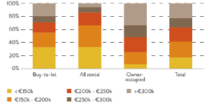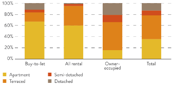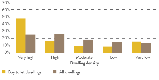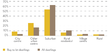 Voor Groot-Brittannië ontbreken deze gedetailleerde gegevens. Wel is duidelijk dat huur het meest voorkomt in Groot-Londen. Hier is het aandeel van huurwoningen 30% tegen een landelijk gemiddelde van 20,5%. Gecorrigeerd voor Londen daalt het percentage naar 18,5%. Ook voor de Britten geldt, dat de meeste huurwoningen voorkomen in stedelijke gebieden.Figuur 8 Locatie Buy-to-let in het VK