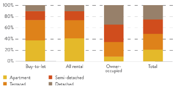 Als het om Buy-to-let gaat, verhuurt de Britse huisbaas het liefst een appartement of een rijtjeshuis. In Nederland gaat de voorkeur overweldigend uit naar het appartement. Naast het rijtjeshuis verhuurt de Nederlandse huisbaas toch verhoudingsgewijs veel (semi) vrijstaande huizen.Figuur 5 In het VK is het appartement en het rijtjeshuis populair