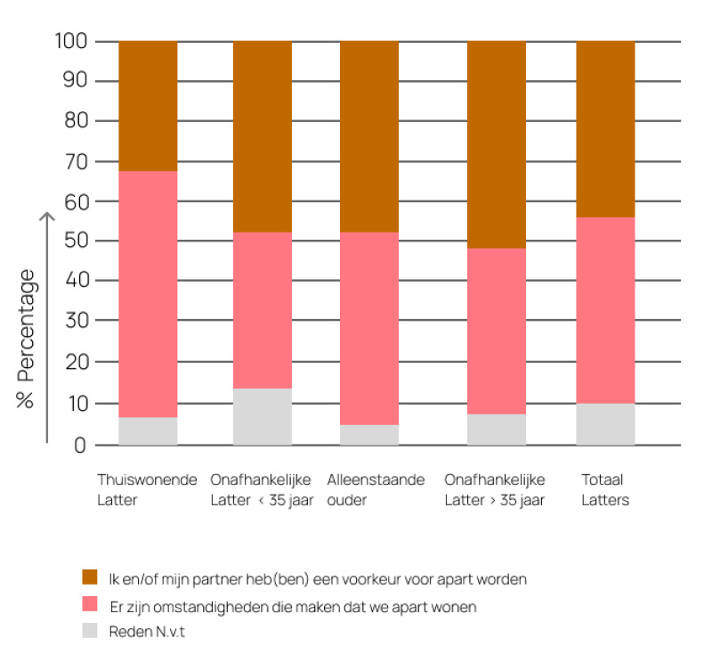 Bijna de helft van de Latters geeft aan dat de omstandigheden hen tot apart wonen dwingt. Bij de jongste generatie is de beperking vaak het ontbreken van voldoende en betaalbare woningen. Voor de ouderen is een beperking het hebben van kinderen. Het hebben van thuiswonende kinderen kan uitmonden in heel ingewikkelde beslissingen.
