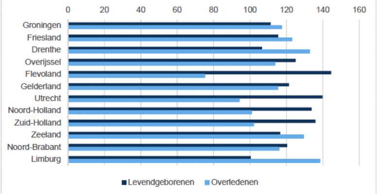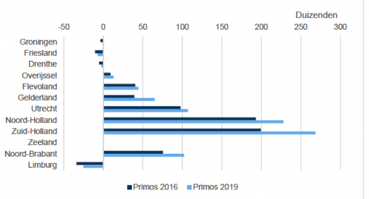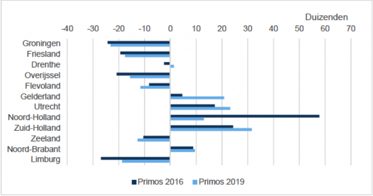 De bevolkingsontwikkeling van een provincie is niet alleen afhankelijk van geboortes maar ook van migratie. Ook in dit opzicht zijn de verschillen heel groot in Nederland. De provincie Groningen kent het hoogste vertrekoverschot van Nederland gevolgd door Zeeland. Utrecht heeft het hoogste vestigingsoverschot gevolgd door Gelderland.Figuur 2 Prognose saldo binnenlandse migratie, 2018 - 2029