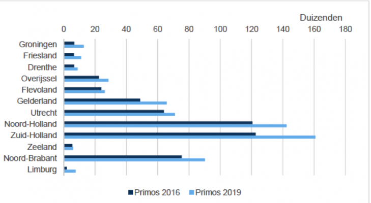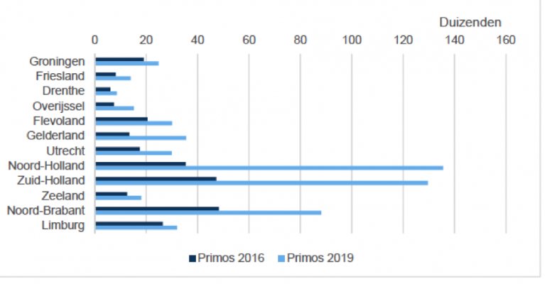Een stagnerende of geringe bevolkingsgroei wil overigens niets zeggen over de ontwikkeling van het aantal huishoudens. Tot 2029 zal in alle provincies het aantal huishoudens blijven stijgen als gevolg van de verder gaan de individualisering. In Zuid- en Noord-Holland zal vanwege de hoge bevolkingsgroei het aantal huishoudens het meest toenemen, maar ook in een provincie als Gelderland is de groei van het aantal huishoudens groot, ongeveer even groot als in Utrecht. De bevolkingsgroei is echter veel lager dan in Utrecht.Figuur 5 Ontwikkeling van het aantal huishoudens, 2018 - 2029